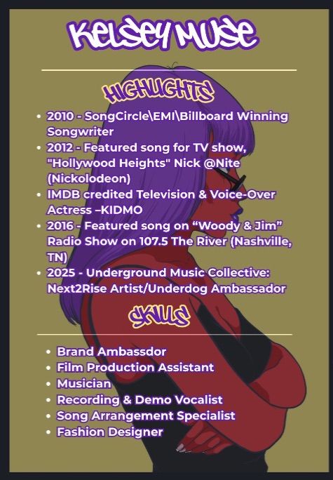 Moving from Oklahoma to Nashville, TN in 2003 to pursue her music career, Kelsey Muse has accomplished TV credits, song placement and songwriting awards starting in her young teens. In 2009, she began as a featured artist/actress in the TV show series, "iShine Knect" on TBN (Trinity Broadcast Network) along with fellow artists like Jamie Grace & Luke Benward. At 17, she became an award winning songwriter by Song Circle (Billboard & EMI). As a performer, she was chosen to showcase for three divisions of the NACA College Circuit in 2010. Soon after, "Dear You" was a featured song for the Nick @Nite TV show, "Hollywood Heights" on Nickelodeon in 2012. While performing at festivals with thousands in attendance, she wrote for publishing houses and developed more of her sound in the urban pop lane along with pushing the status quo that it was ok to be unique in her sound with a message; therefore her next single was born, “1994” released in 2015. The same year, Nashville’s 107.5 The River morning show, “Woody & Jim” named her “YouTube’s Day Artist” and the tune was played in rotation. In 2019, with moody notes and a haunting hook, the next chapter in her brand release was called, “Sunglasses.” This year in 2025, her upcoming single, “Whispers” is up next to be released. The catchy tune conveys a message of hope and motivation to the Muses and Misfits of the world.https://kopage.kelseymuse.com/about